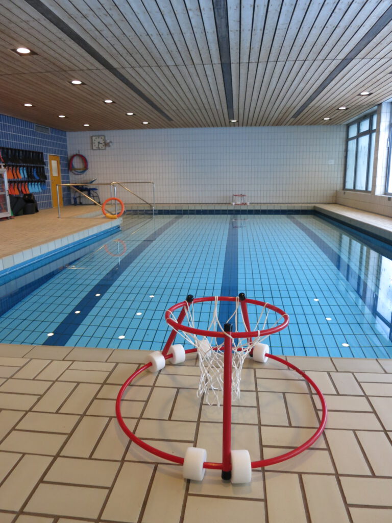Des weiteren können wir in 5 Minuten zu Fuß eine weitere neu renovierte Sporthalle erreichen und vor allem das hoch geschätzte Lehrschwimmbecken. Schwimmen ist lebenswichtig und wir legen großen Wert darauf, dass evtl. schwache Schwimmer oder Nichtschwimmer bei uns in kleinen Gruppen das Schwimmen lernen. Schwimmunterricht findet von der 5. bis zur 7. Klasse statt.