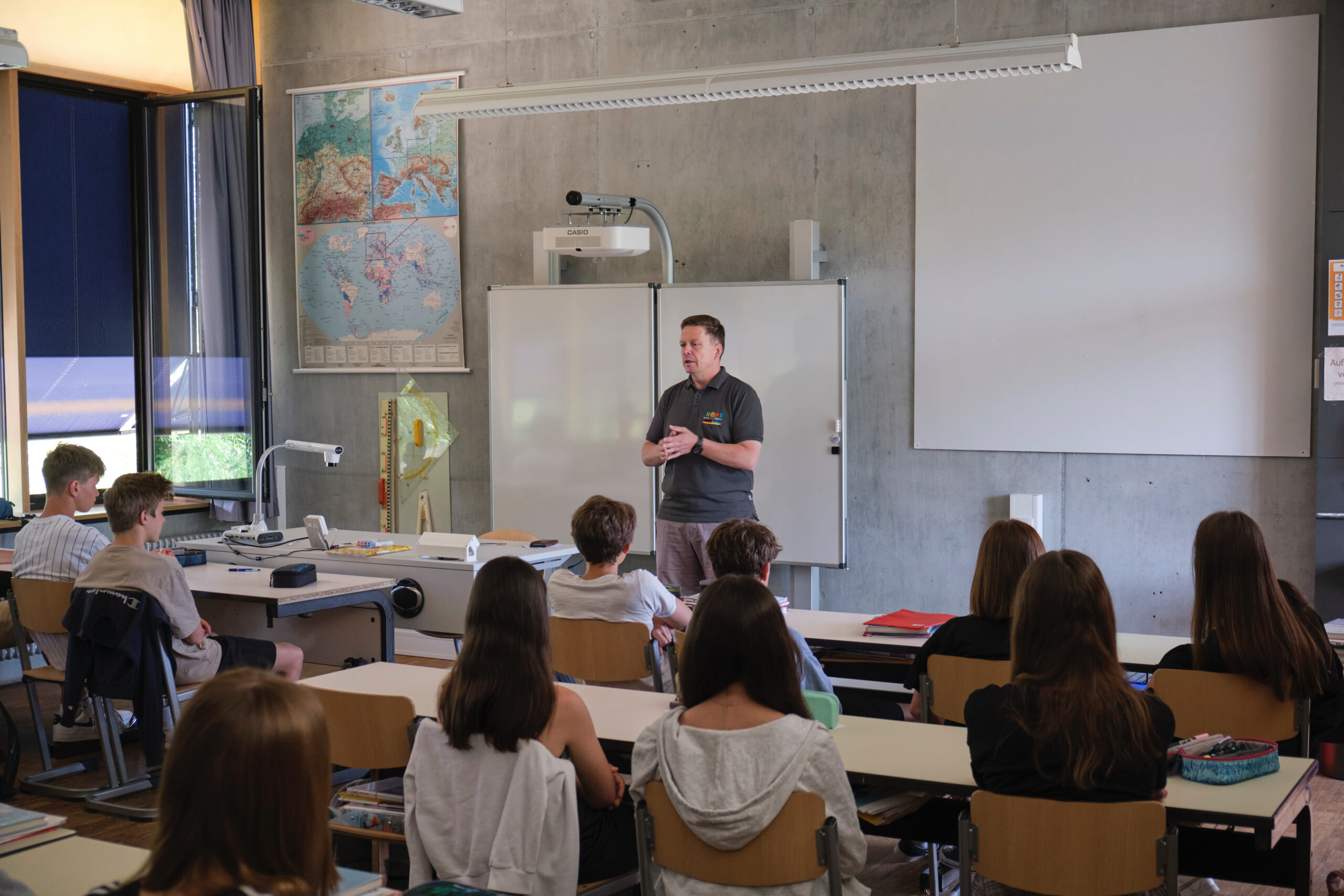 Herr Ponto, der Vorsitzende des Vereins besuchte die Schüler:innen anschließend im Unterricht, um sich für das Engagement der Klasse 8c zu bedanken und berichtete vom letzten Hilfkonvoi in der Ukraine.