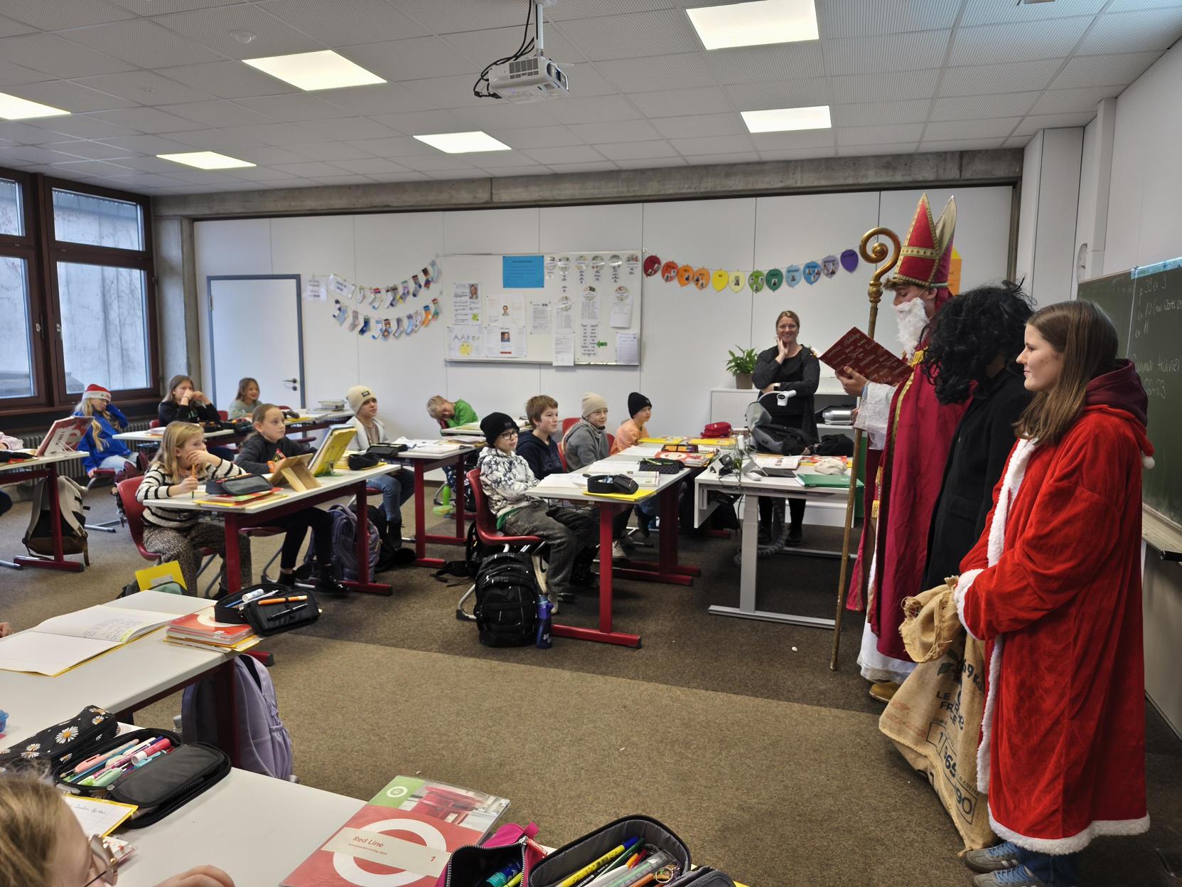 Der Nikolaus und seine Helfer gingen durch die Klassenräume und sorgten für leuchtende Augen. Neben wohlverdientem Lob für Fleiß, Hilfsbereitschaft und guten Gemeinschaftssinn hatten sie auch den ein oder anderen freundlichen Tadel im Gepäck. Als kleine Überraschung verteilte die Elfin zudem Schokolollis an alle Kinder.