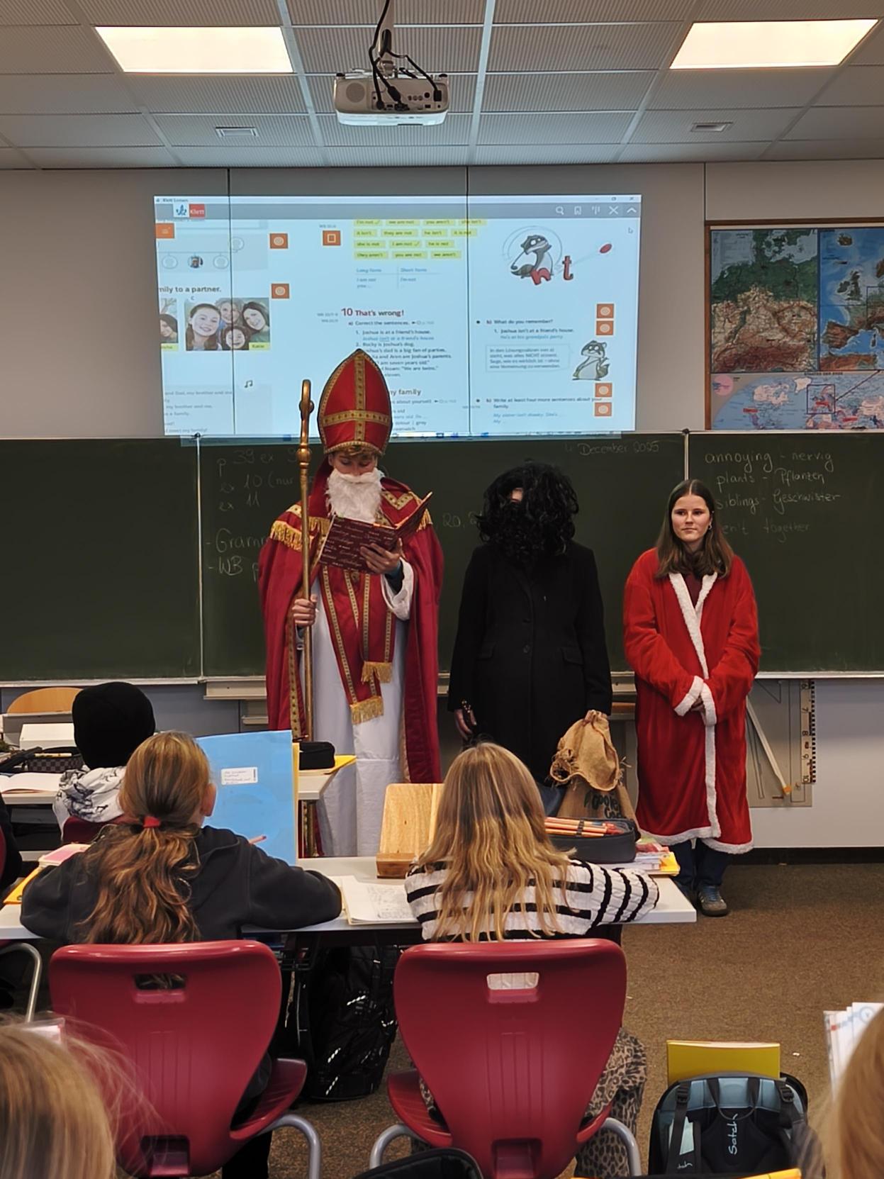 Am 05. Dezember 2025 besuchte der Nikolaus gemeinsam mit Knecht Ruprecht und einer Elfin die Schülerinnen und Schüler der 5. und 6. Klassen. Organisiert wurde die Aktion von der SMV, die den Besuch mit viel Engagement vorbereitet hatte.