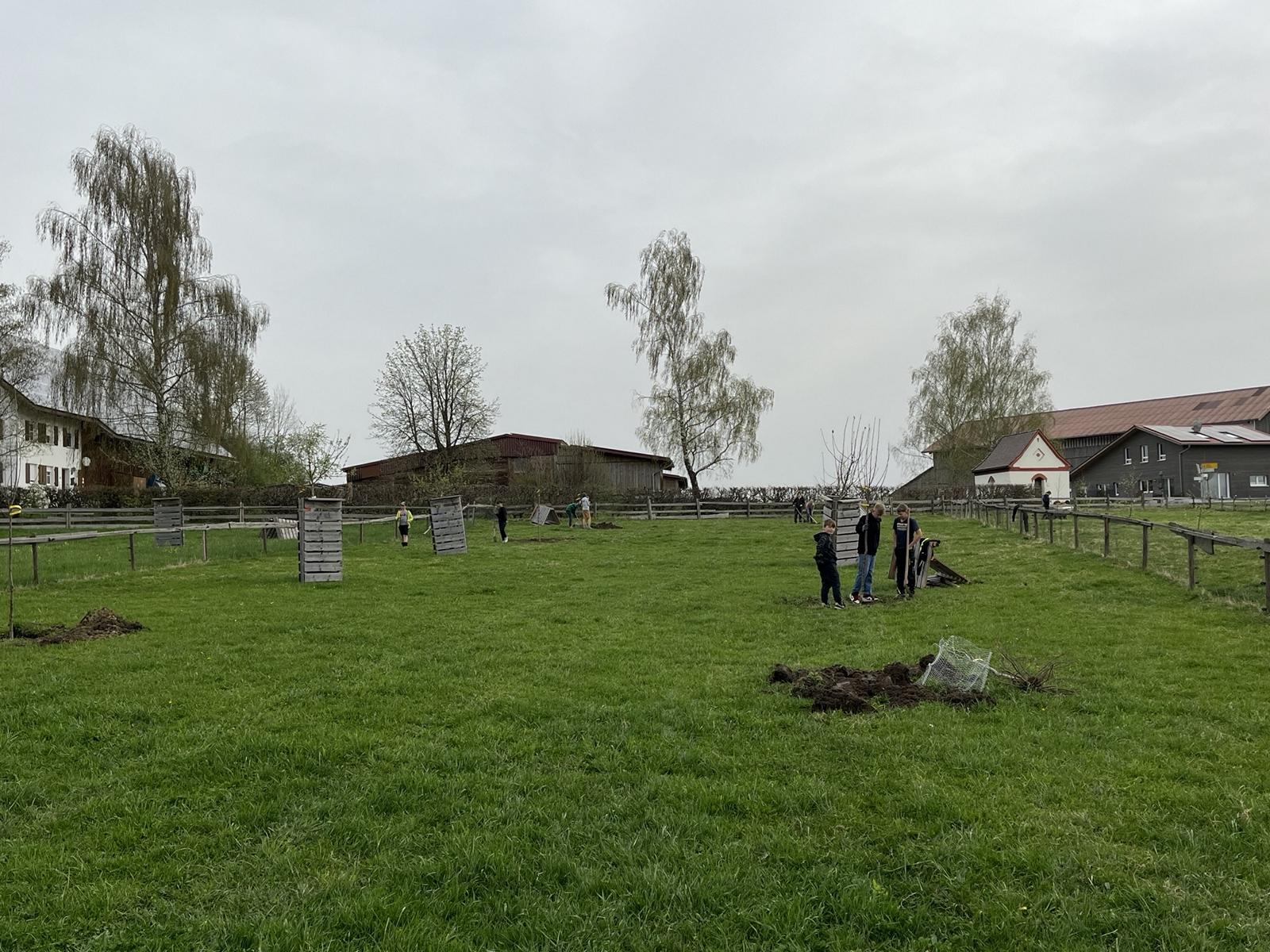 Ein Jahr lang Baumbeobachtung liegt hinter uns, vom Laubfall bis zum neuen Austrieb. Nun haben wir eine Streuobstwiese, deren Bäume abgestorben waren, renaturiert. Insgesamt haben wir dieses Jahr 26 Bäume gepflanzt. Eine Schutzreihe mit Rotbuchen, dahinter verschiedene Apfelbaumsorten.